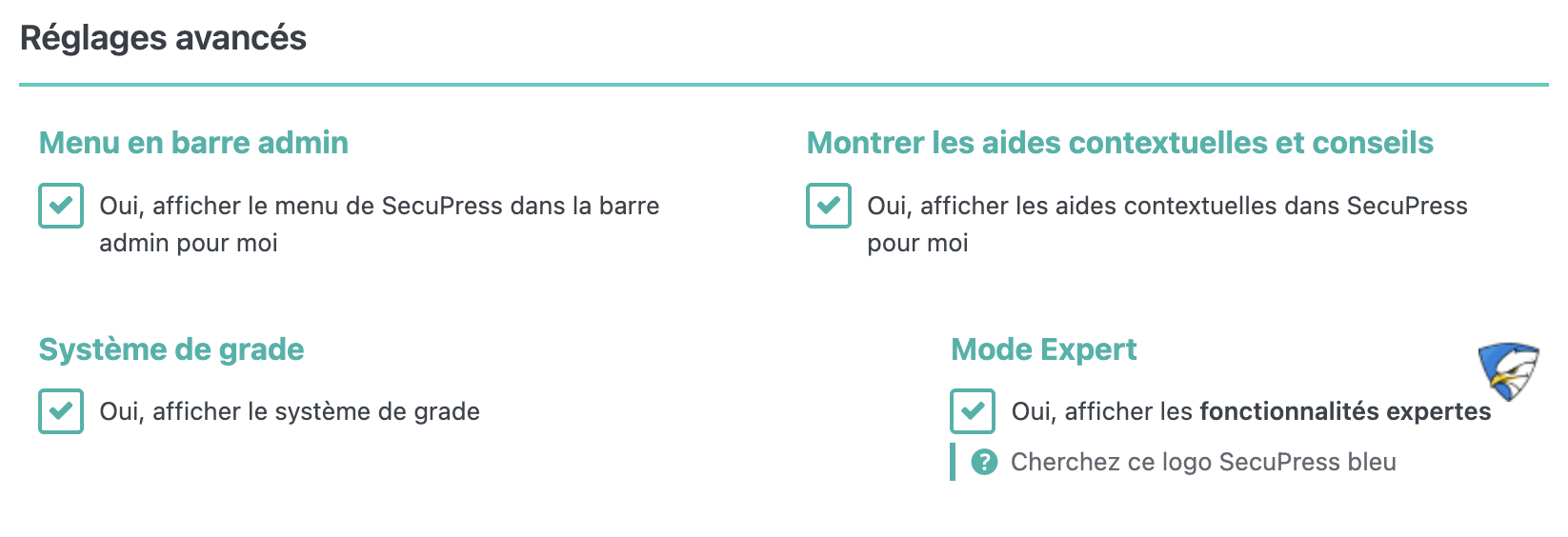Vous pouvez déjà trouver ces paramètres dans le module Tableau de bord. Il s'agit des 4 paramètres avancés : Menu de la barre admin, Aide contextuelle et conseils, Système de grade et Mode expert.